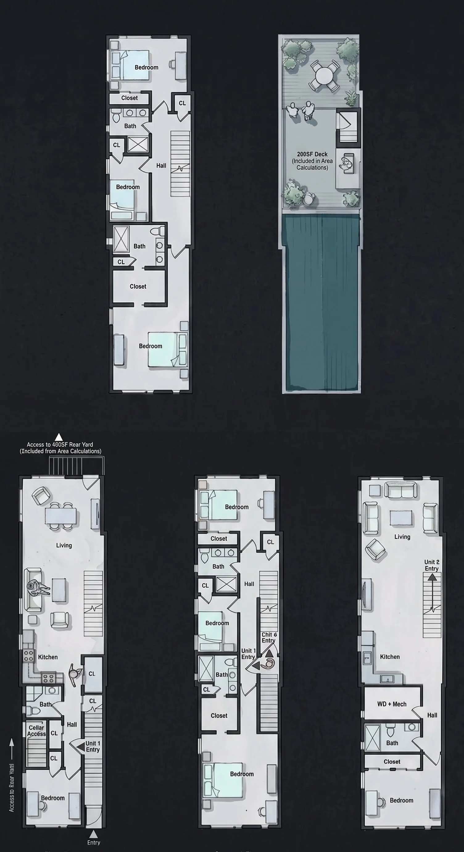 A sleek, multi-story facade of light cladding and dark accents sets this 2-family dwelling apart from its traditional rowhouse neighbors. Each unit features open-concept living spaces flooded with natural light, topped by a rooftop deck with cityscape views.