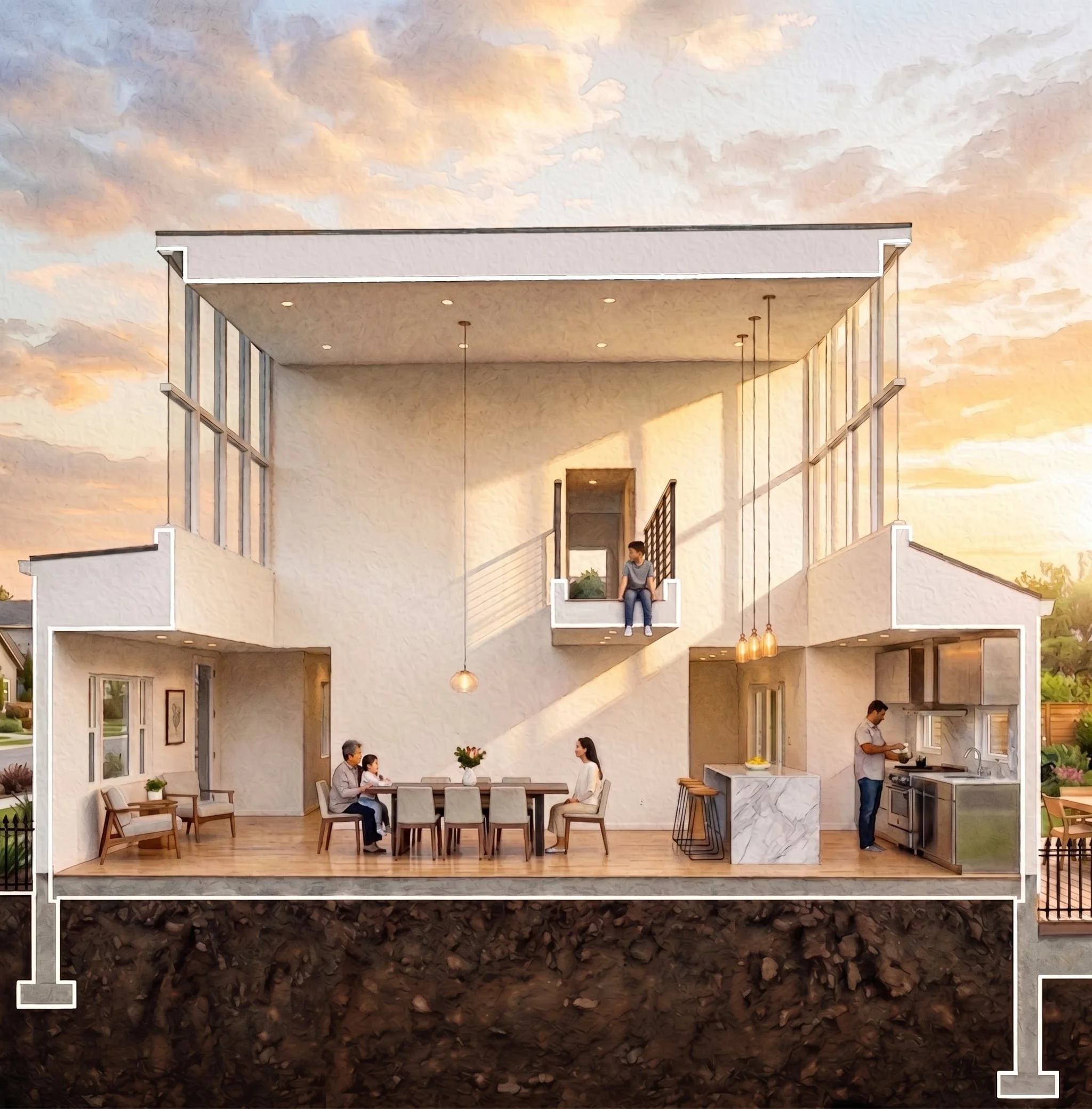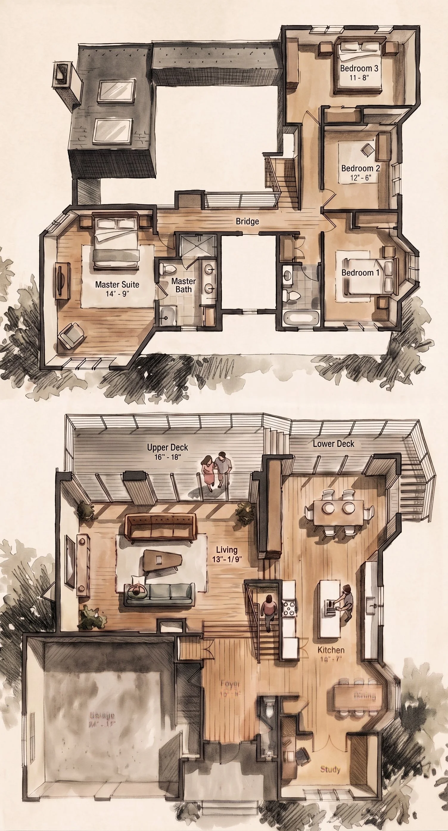 A dramatic double-height living area anchors this modern single-family home, with an internal bridge linking the Children's Wing to the Master Suite. Panel-clad exteriors, large windows, and warm wood interiors balance bold contemporary architecture with natural warmth.