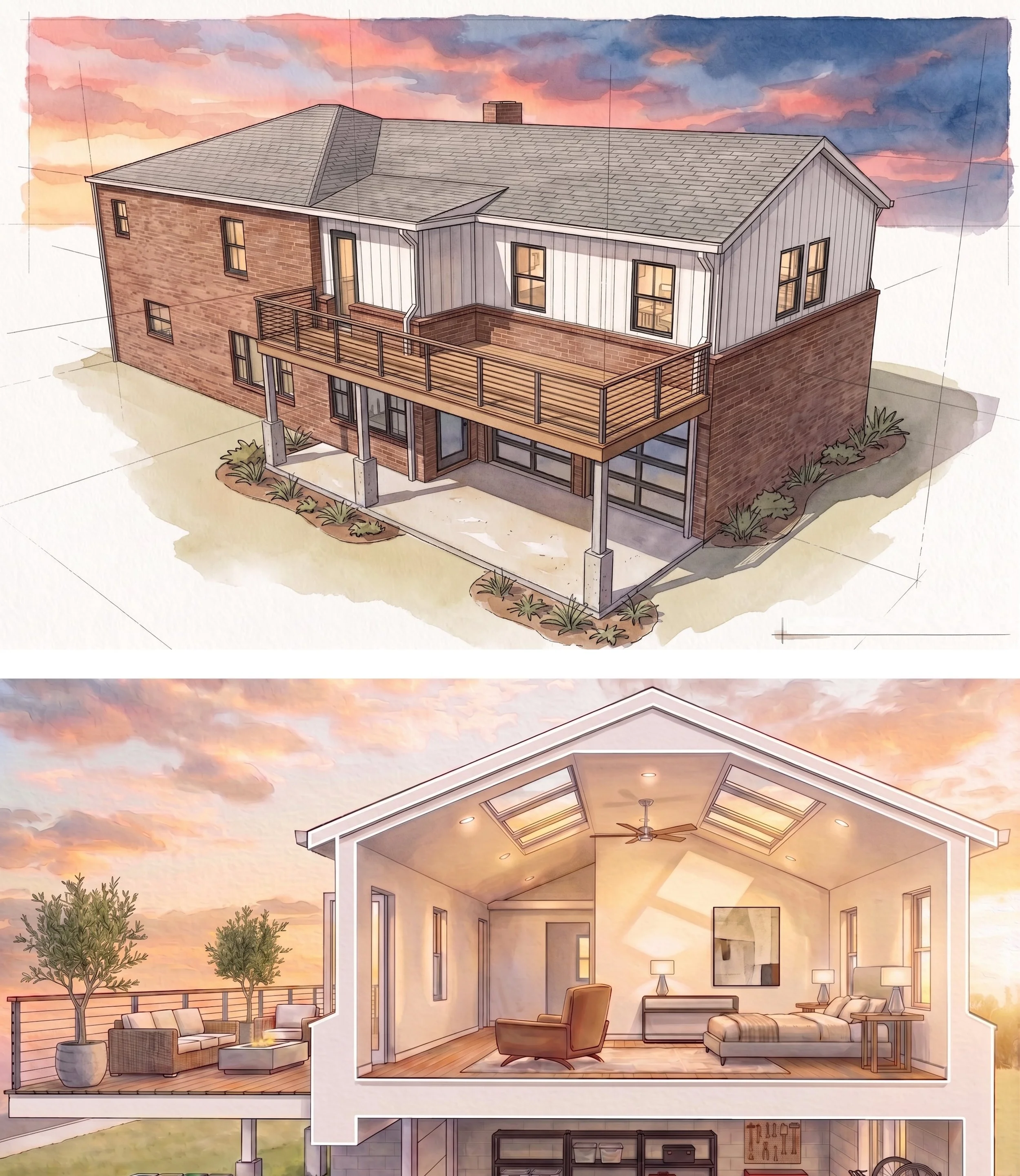 This home addition introduced a new master bedroom suite and an outdoor deck, thoughtfully expanding the existing residence while respecting its traditional character. The design features a vaulted interior and a seamlessly integrated outdoor living space, bringing both elegance and functionality to the upper level.