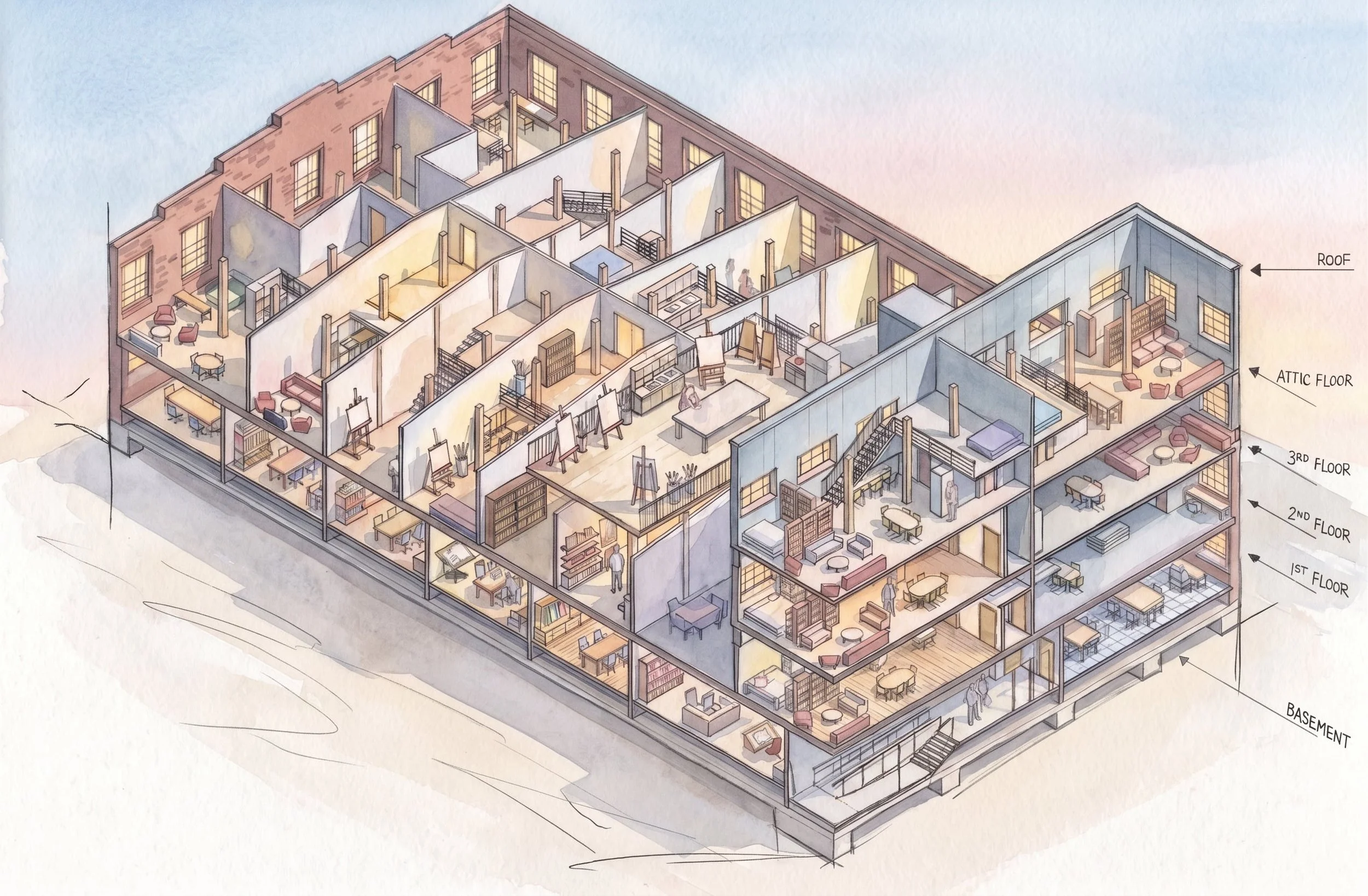 Industrial to Residential Adaptive Reuse with 24 Loft Style Artist Work/Live spaces. In addition, the tenants will be able to enjoy the mercantile spaces located on the ground floor.