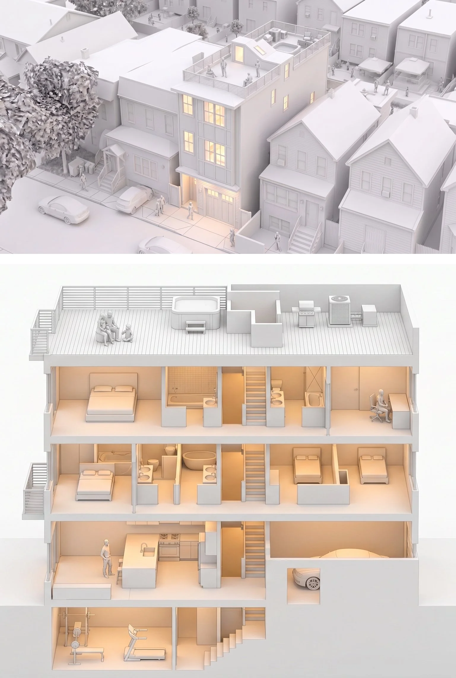 A crisp, white-paneled facade quietly asserts itself among Jersey City's traditional rowhouses. Four efficiently stacked stories conceal a richly layered interior tailored to modern family living.